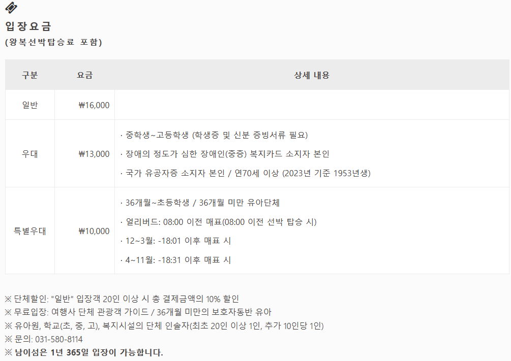 남이섬은 연중무휴이고 입장료는 아래의 사진 확인해 주세요.