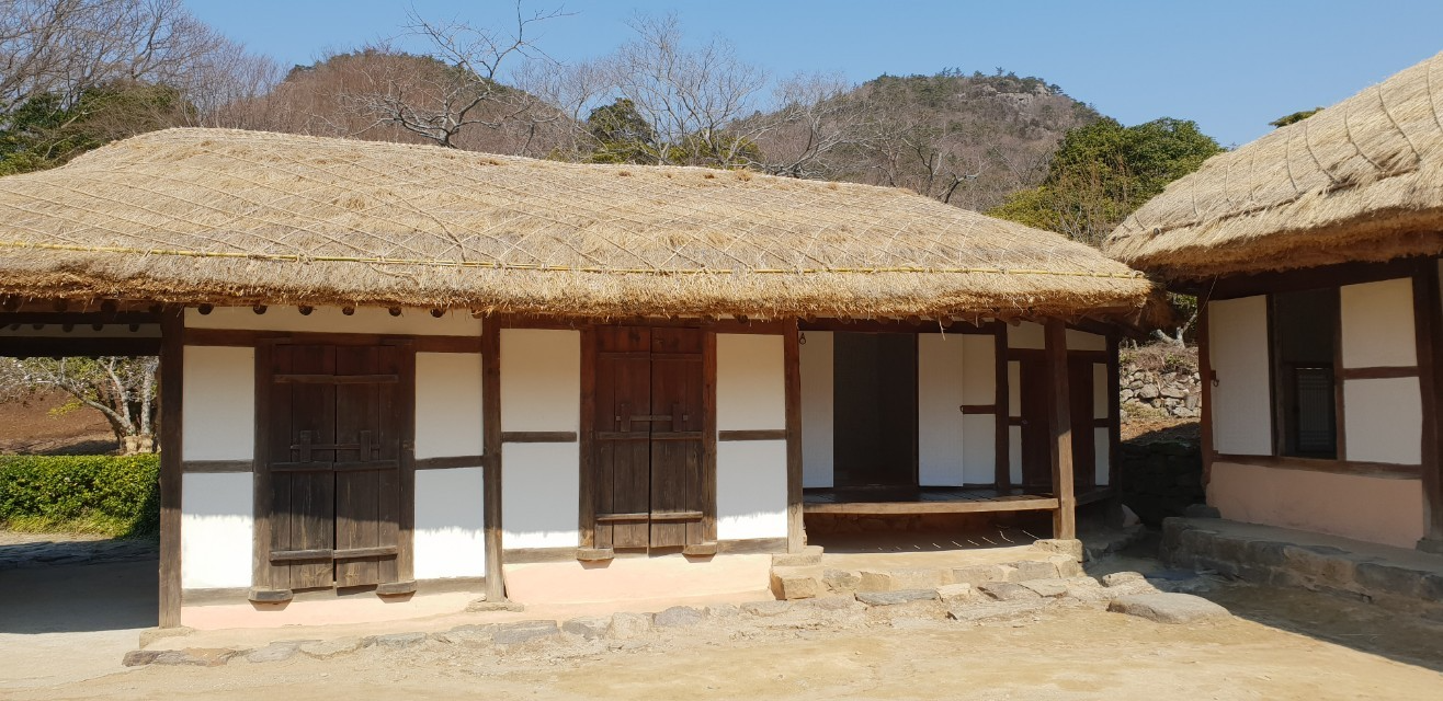 초가집과 푸릇푸릇한 나무들, 그리고 연못이 있고