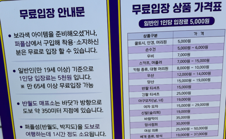 퍼플섬에 가실거라면 미리 보라색 안경이나 토시, 손수건 등을 챙겨가시면 좋겠어요 👍