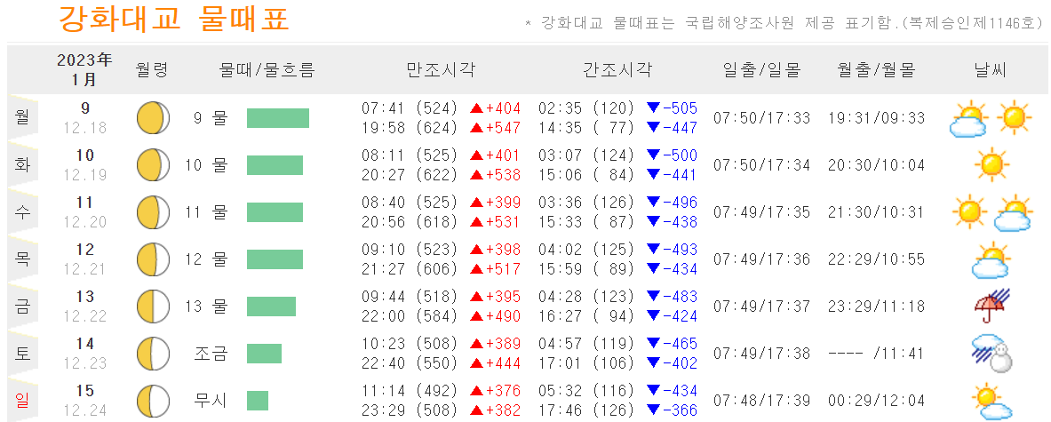 이번주의 강화도의 일출/일몰, 만조/간조 시간표를 가져와보았습니다.