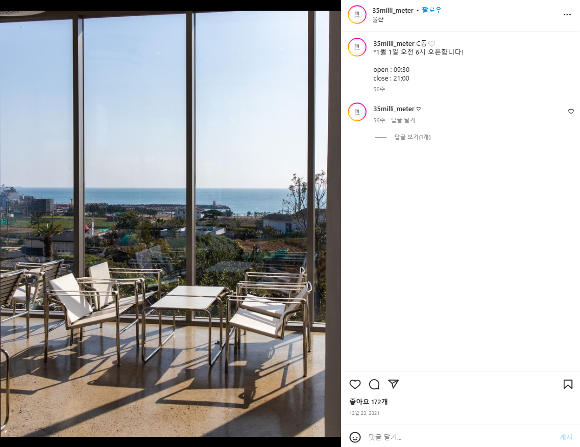 경주에는 예쁜 카페가 굉장히 많은데요, 양남 주상절리 근처 카페로 '35mm' 라는 카페를 추천드리고 싶어요.